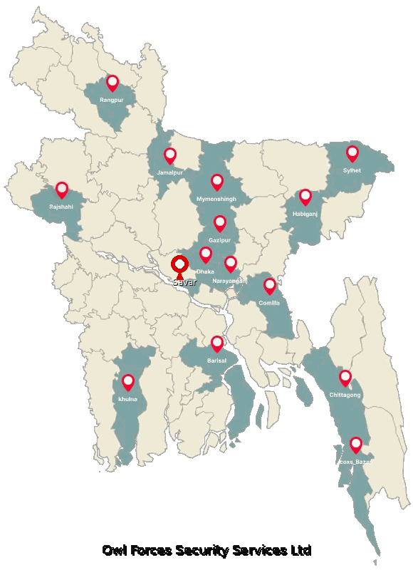 We provide security guard services across all divisions of Bangladesh. Key location replace “Coverage by Division